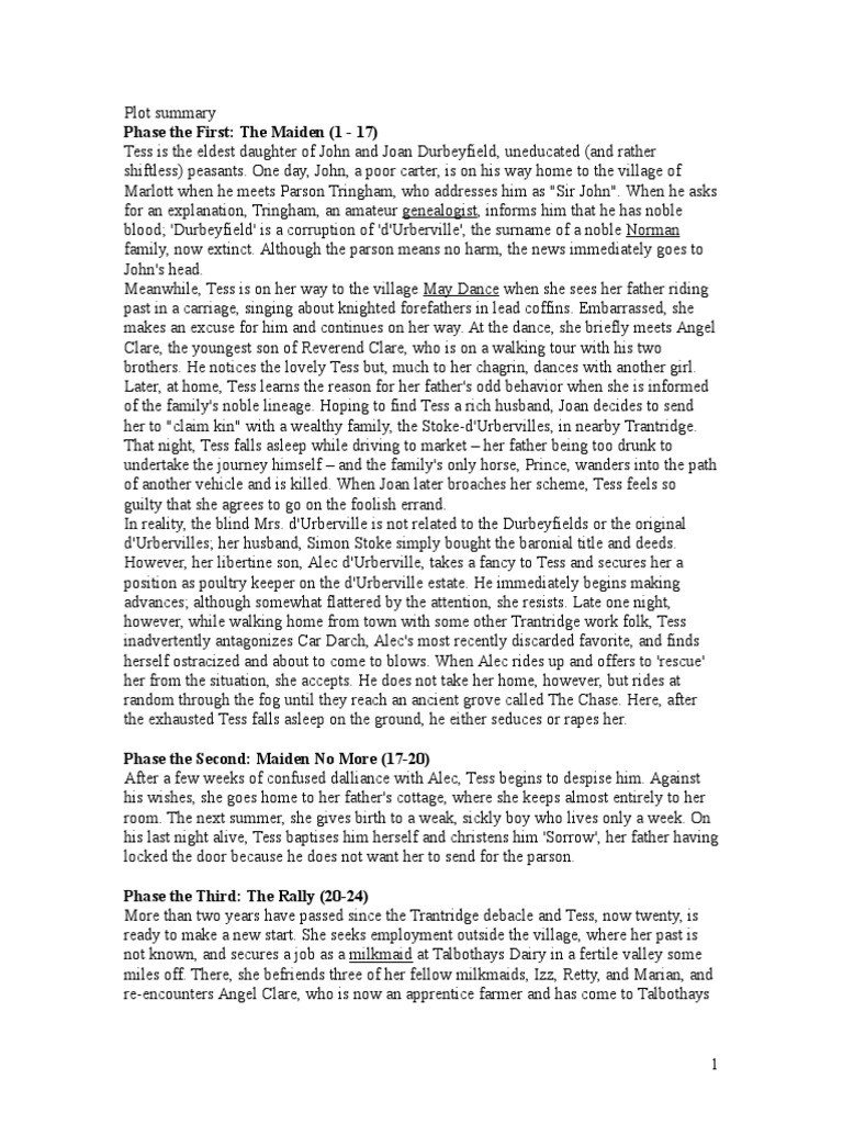 Tess of the d'urbervilles (or its full title tess of the d'urbervilles: John durbeyfield, a peddler, is on his way home to his village, marlott when he runs into an old parson. Tess durbeyfield lives in the rural village of marlott in southwest england. Summary of the novel after john durbeyfield, a country peasant, learns he is descended from a noble family, he gets tipsy at a local alehouse. As the novel progresses the reader is introduced to many aspects of tess as she grows from being a child on the verge of adulthood to a mature and experienced woman.